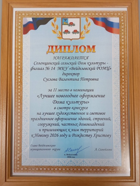 Валентина Суслова, директор Солонцинского сельского дома культуры и Тамара Кузнецова, заведующая Поповским сельским клубом были награждены дипломами за II место в номинации «Лучшее новогоднее оформление сельского клуба» в смотре - конкурсе на лучшее художественное и световое праздничное оформление зданий, строений, сооружений, частных домовладений и прилегающих к ним территорий к Новому 2026 году и Рождеству Христову.