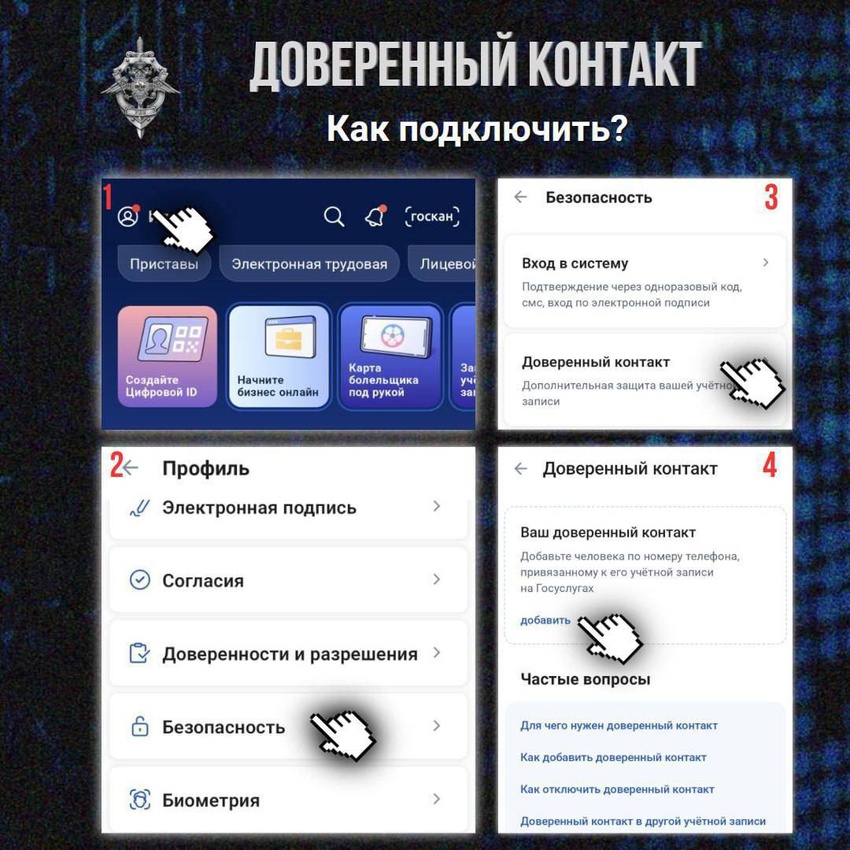 Подключение «Доверительного контакта» – простая, но эффективная защита. Достаточно выбрать надежного человека из числа родственников или друзей, имеющего подтвержденную учетную запись на Госуслугах. Доверенное лицо будет получать запросы на подтверждение важных действий (например, при попытке смены данных или восстановлении доступа), защищая профиль от мошенников, что особенно актуально для лиц преклонного возраста и детей.